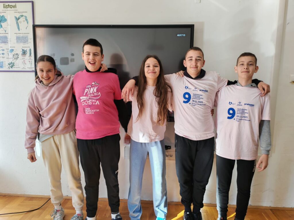 Učenici i djelatnici škole obukli su ružičaste majice kao jasnu poruku da svako dijete zaslužuje sigurno i poticajno okruženje. Time smo zajedno pokazali koliko je važno graditi školu u kojoj se njeguje empatija, tolerancija i međusobno razumijevanje.
