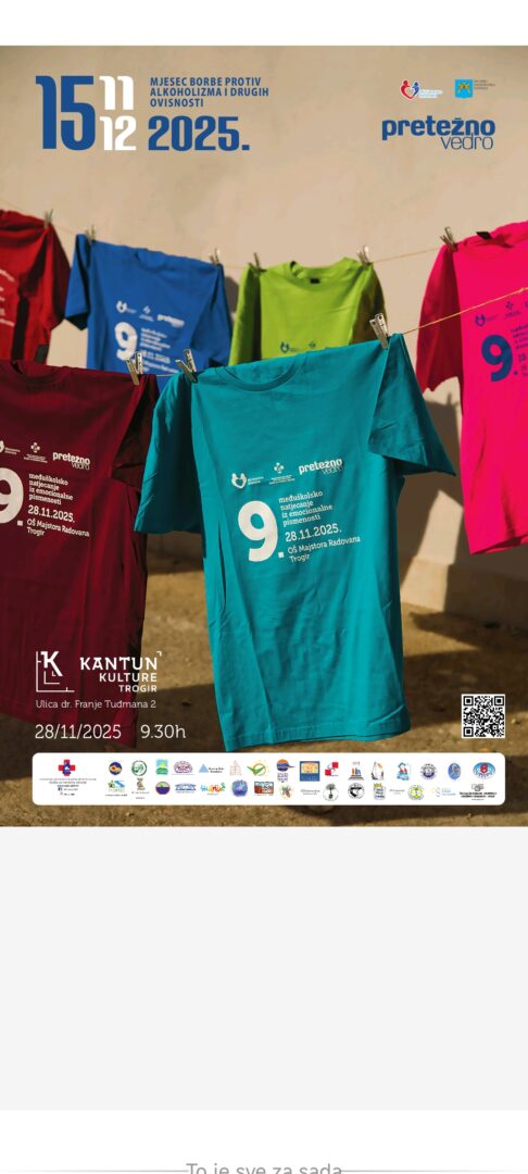 Središnji događaj Mjeseca borbe protiv ovisnosti i ove je godine javnozdravstveni projekt Pretežno vedro. U OŠ Majstora Radovana u Trogiru održat će se 9. međuškolski turnir na županijskoj razini 28.11.2025. s početkom u 9:30, s početnim i završnim programom u Kantunu Kulture, kulturnim centrom grada. Projekt je osmišljen kao univerzalni pristup prevenciji razvoja ovisnosti, a specifični cilj emocionalnog opismenjavanja učenika postiže se kroz organizirana školska i međuškolska natjecanja u kojima učenici 6. razreda uče prepoznavati i imenovati vlastite i tuđe emocije te prikladno reagirati u svakodnevnim životnim situacijama. U tu svrhu osmišljen je alat – društvena igra „Pretežno vedro“, čija je e- verzija unaprjeđena u protekloj školskoj godini kako bi bila aktualna novim generacijama učenika. Za potrebe vrednovanja projektnih aktivnosti primjenjuje se upitnik samoprocjene socioemocionalnih kompetencija WCSD skraćena verzija (engl. The Washoe County School District Social and Emotional Competency Short-Form Assessment). Upitnik je preveden na hrvatski jezik metodom dvostrukog prijevoda. U šk. god. 2024./2025. na ulaznom i izlaznom upitniku uparena su 753 upitnika na uzorku učenika šestih razreda iz 29 škola s područja Splitsko-dalmatinske županije. Statistička analiza pokazala je da su učenici svoje sposobnosti samoprocjenjivali višima nakon izlaznog upitnika nego nakon ulaznog upitnika. Nalazi provedenog vrednovanja govore u prilog korisnosti projektnih aktivnosti u radu s mladima na vještinama koje se tiču emocionalne pismenosti. Navedeno dodatno obavezuje djelatnike Službe za mentalno zdravlje da šire mrežu suradnje te unaprjeđuju i projektne aktivnosti u ovom, ali i drugim javnozdravstvenim projektima vezanim za ponašajne ovisnosti, uključujući i neprihvatljiva nasilna ili rizična ponašanja djece i mladih, a sve s ciljem zaštite i unapređenja mentalnog zdravlja u cjelini.