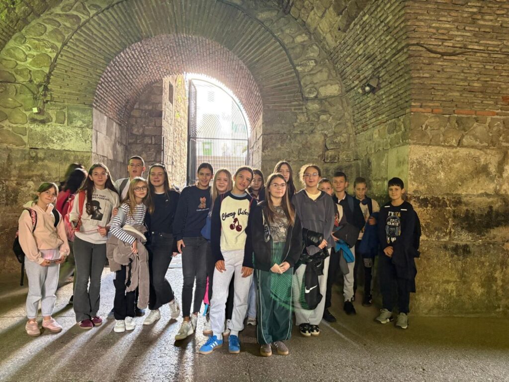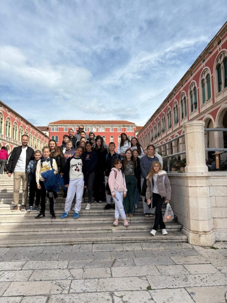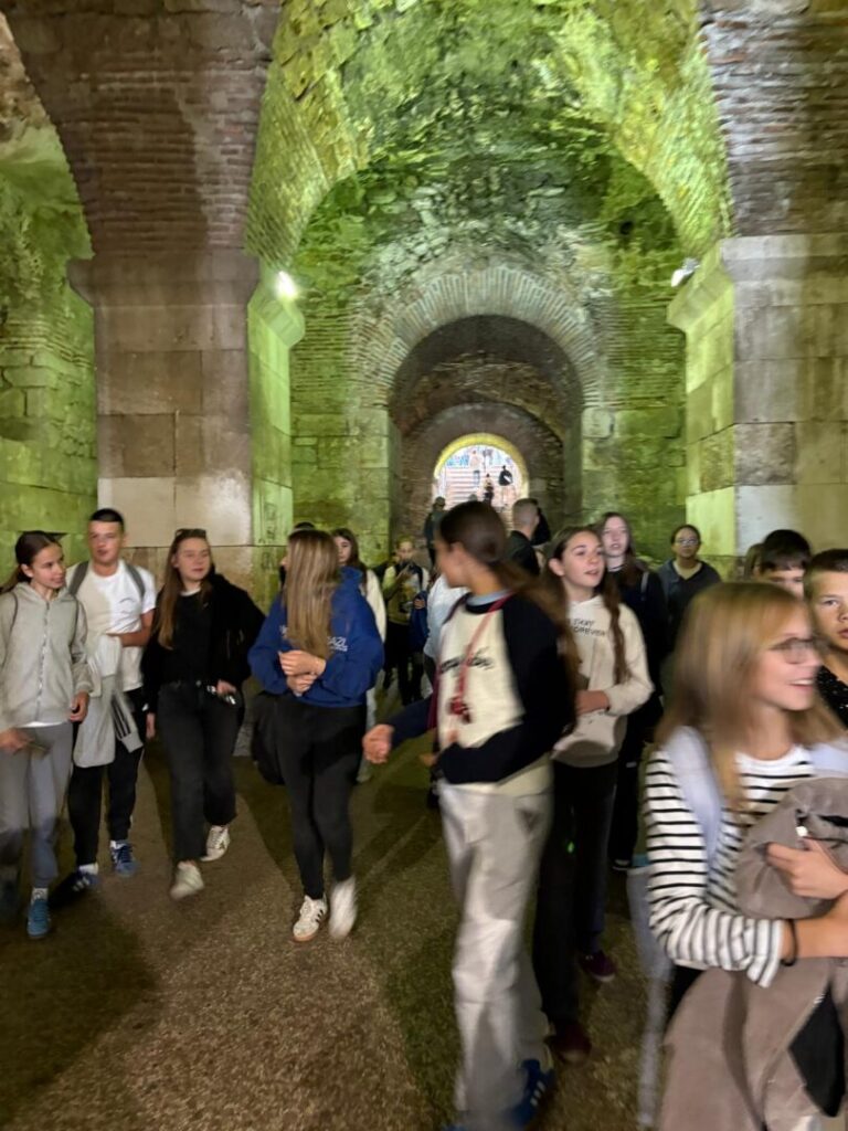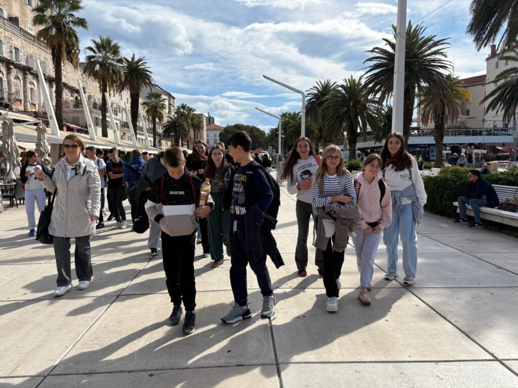Nakon filma prošetali smo starom gradskom jezgrom te učenike proveli po splitskim ulicama. Kroz Peristil i Dioklecijanove podrume došli smo do Obale hrvatskog narodnog preporoda, (poznatije kao splitske Rive) gdje smo se počastili sladoledom. Šetnja se nastavila Marmontovom ulicom do Prokurativa te opet natrag do osunčane Rive.